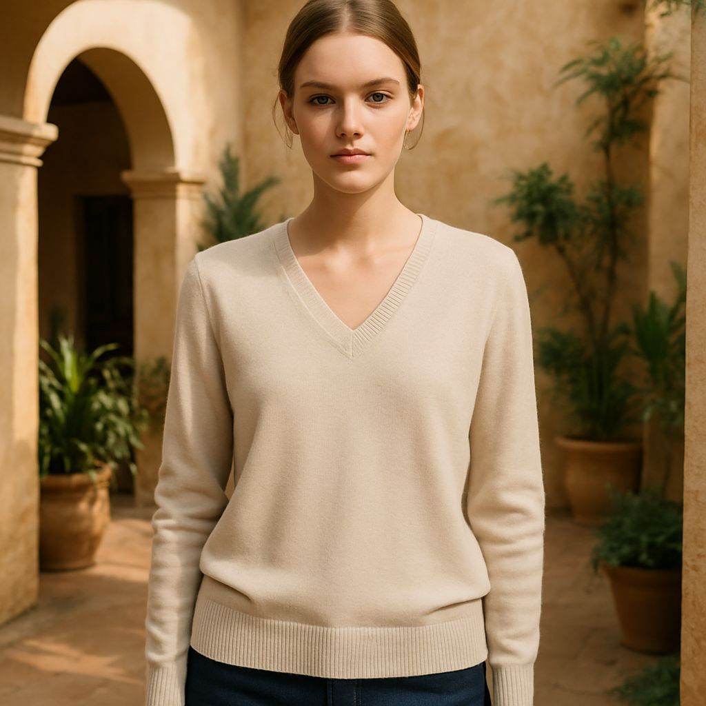 Jersey Beige Claro con Cuello en V y Acabado de Canalé